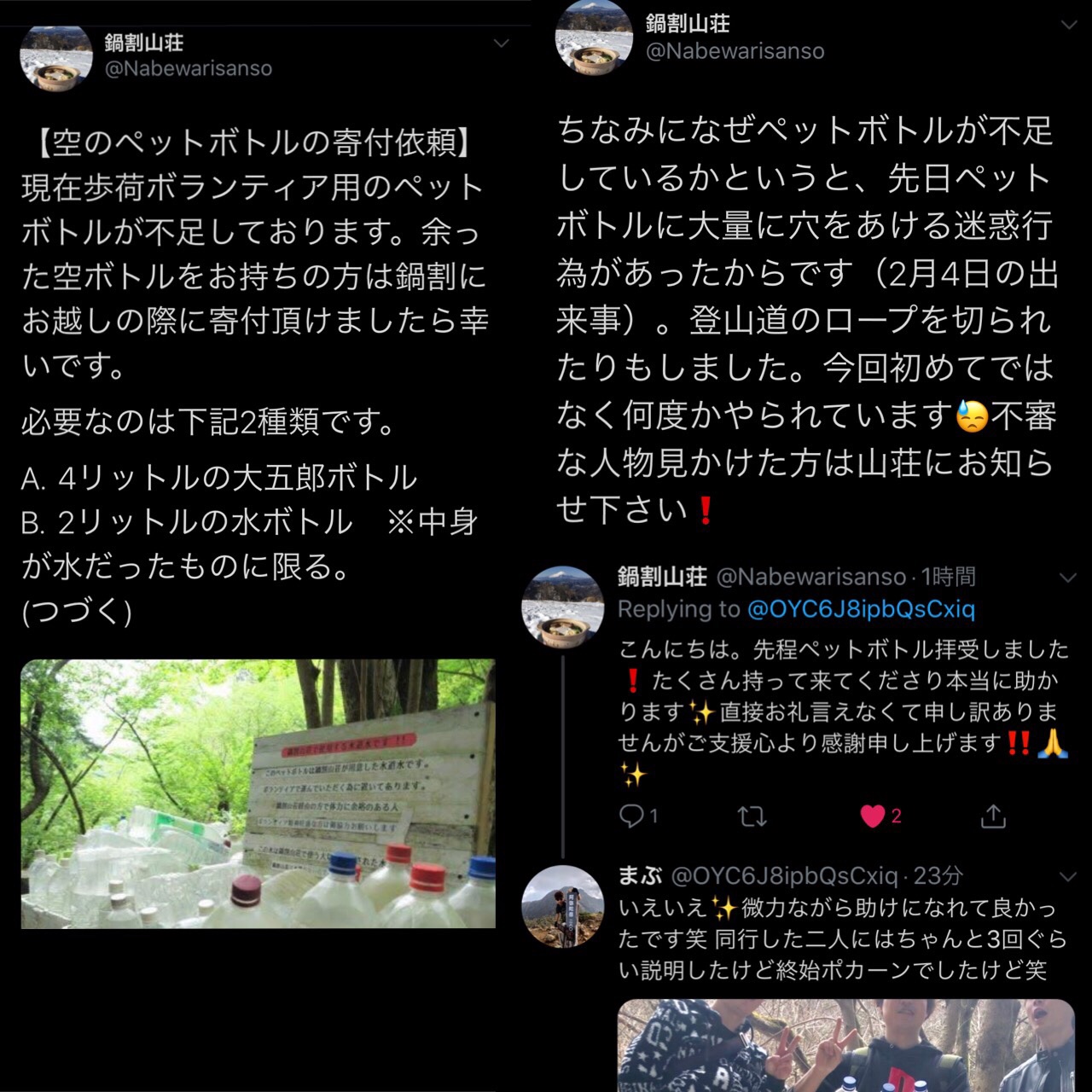 鍋割山荘 On Twitter ちなみになぜペットボトルが不足しているかというと 先日ペットボトルに大量に穴をあける迷惑行為があったからです 2月4日の出来事 登山道のロープを切られたりもしました 今回初めてではなく何度かやられています 不審な人物見かけた方は
